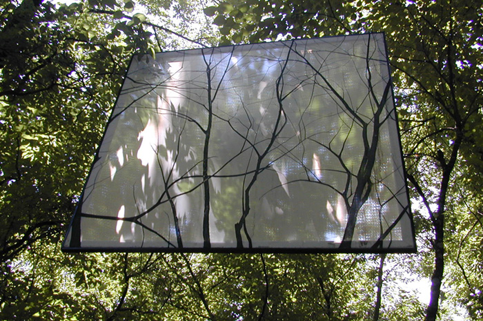 7' x 7' Polyester fabric and India ink on suspended wood frame.