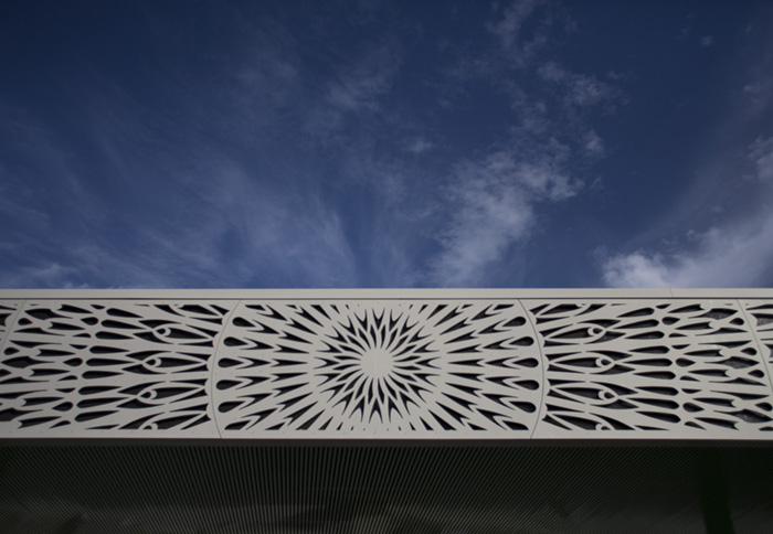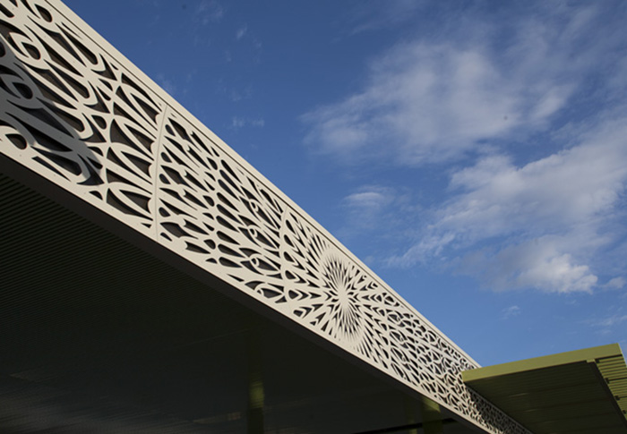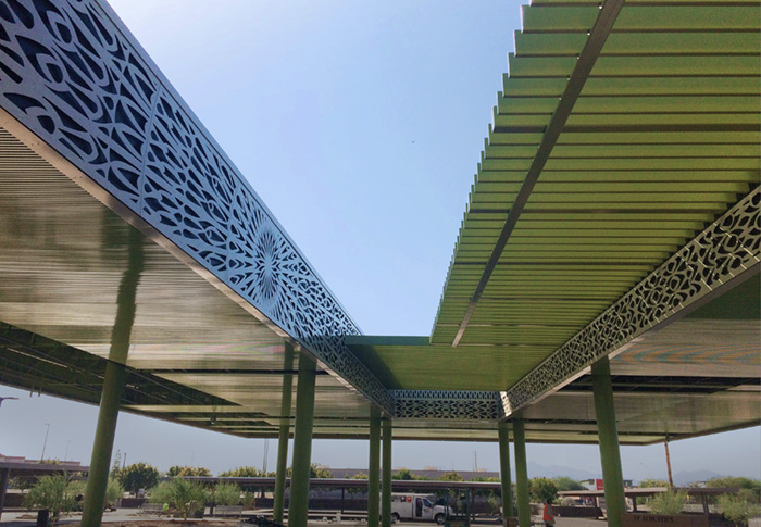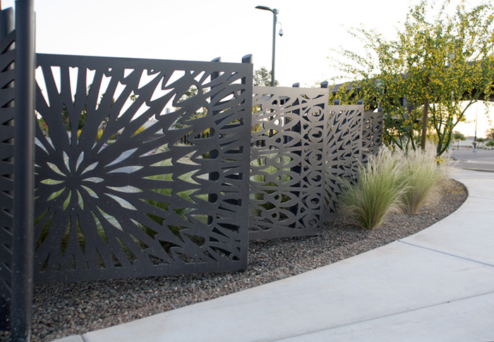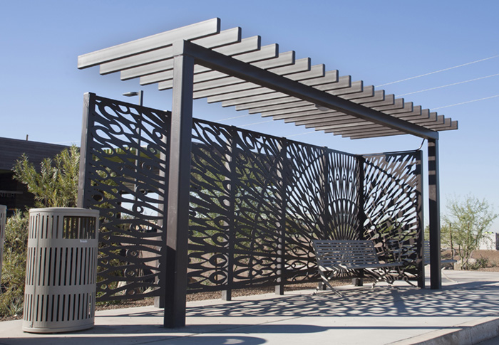 Abstract patterns of cut steel invite people's eyes to wander as they wait for rides at a new transit center. Designs were integrated into the facility's main structure, bus shelter, and fence.