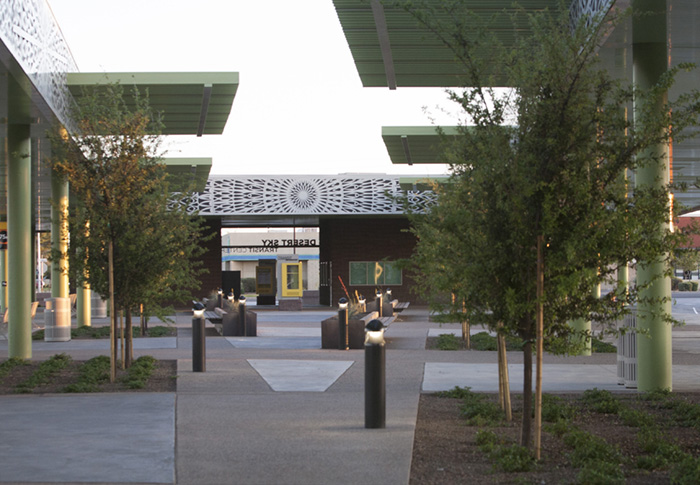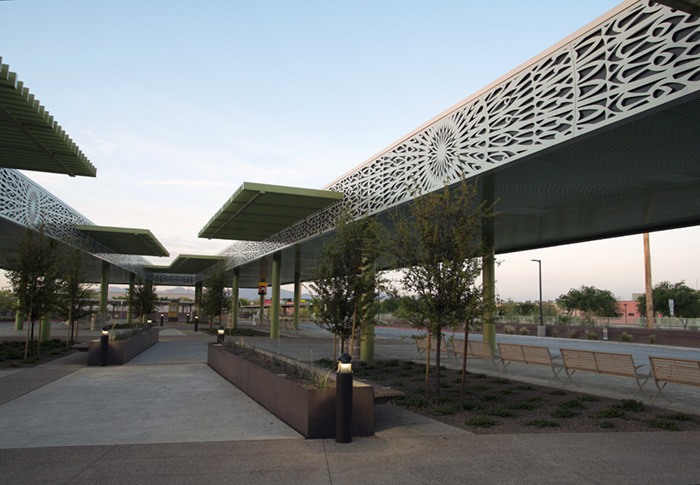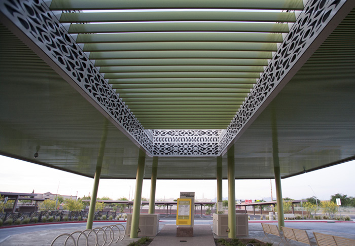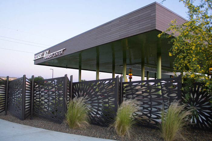Desert Sky Transit Center is a beautiful new facility at 79th Avenue and Thomas Rd—the busiest transit center in the city. I was brought into the project late, when the architect and landscape architect had already designed a comfortable, usable, modern, great space for people to wait for their morning bus. There weren’t any problems that needed to be solved. Asking the question, “What can art add to this place?” I decided on a layer of visual texture—places for people’s eyes to wander while they sat. The patterns keep the eye and mind in constant motion: the designs are celebratory and evocative, sleek and intricate, fluid and precise.