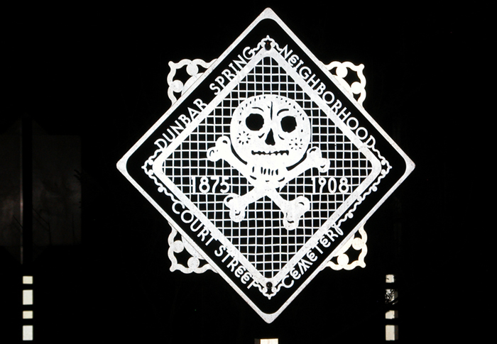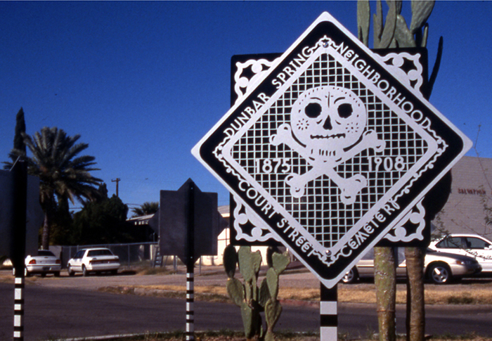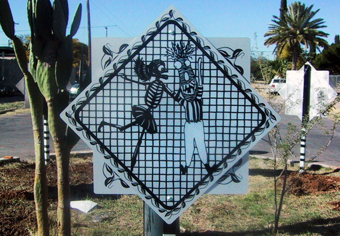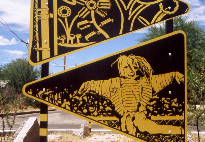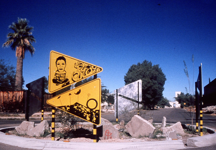 In the Dunbar/Spring neighborhood in Tucson, I worked with members of the community to create artworks for three traffic circles in their neighborhood. To reflect the neighborhood’s rich history and colorful and creative present, I created a series of images incorporated into colorful street signs. Before I started drawing, I spent time meeting the people in the neighborhood going to community meetings, festivals, community tree-plantings, and learning about current neighborhood issues by talking to residents and participating in their neighborhood internet listserv.