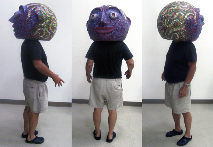 Papier-mâché mask with internal camera and video monitor. A hybrid sculpture⁄performance⁄costume, meant to be experienced from the inside and the outside. The participant wears the mask backwards, giving them a view of what is behind them.