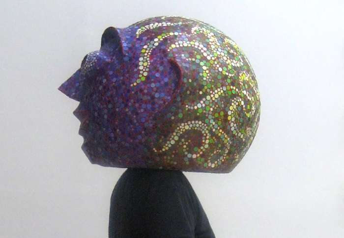 Details: Papier-mâché with paint, head brace, video camera, video monitor.