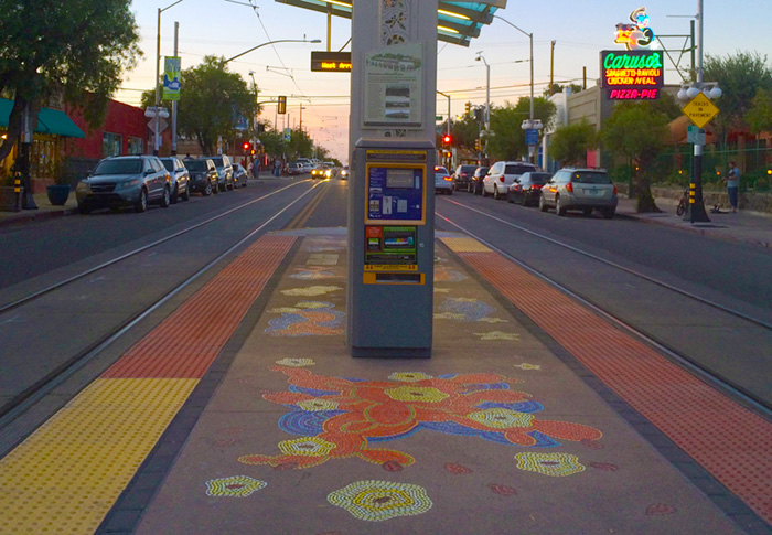 Our aim for the piece was to help the station blend with the festive, colorful atmosphere of 4th Avenue. Bold colors and biomorphic forms of flowers, cactus, bugs, and fruits enliven the station with playful references to the desert and 4th Avenue’s eclectic culture.