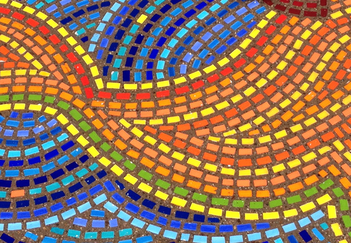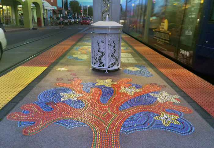 The station furniture (seats, shade panels, trash can and columns) are covered with cut-metal panels featuring a wide swath of dancing forms filled with fun details to be discovered. The station platform has been turned into colorful Lithomosaic mural of psychedelic cactus forms. The two parts work together to make the platform a bright, fun island in the middle of 4th Avenue.