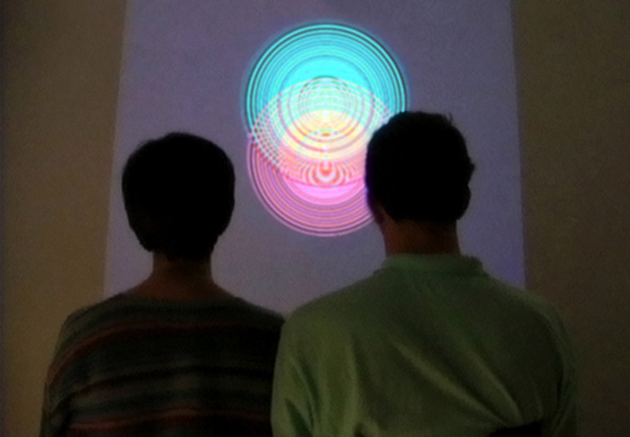 Two sensor belts measure participants’ breathing patterns. Two sets of concentric circles projected in front of them float up and down the wall, creating complex interference patterns as they move in and out of phase.