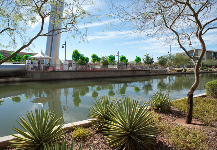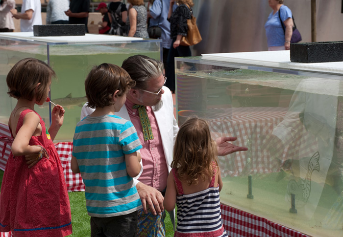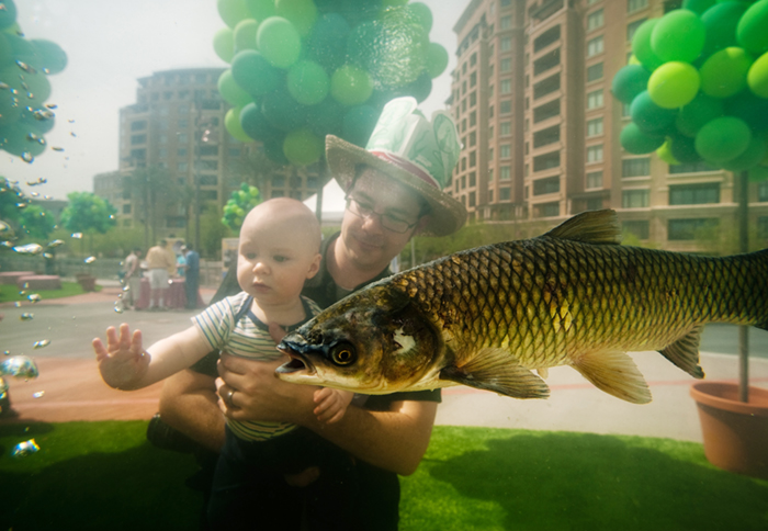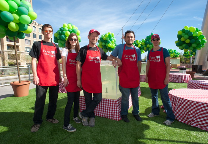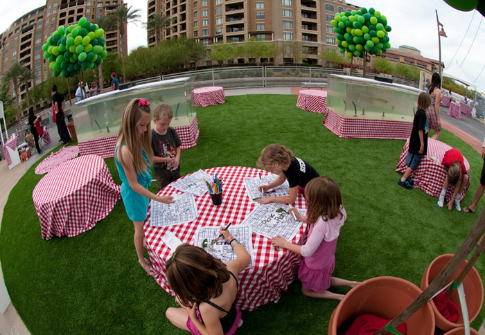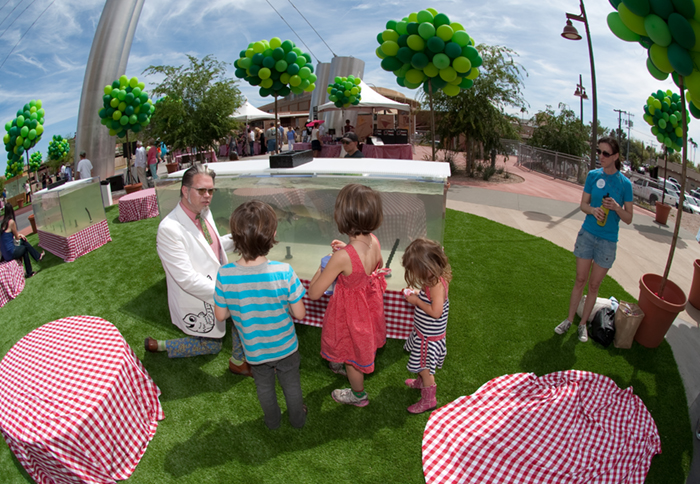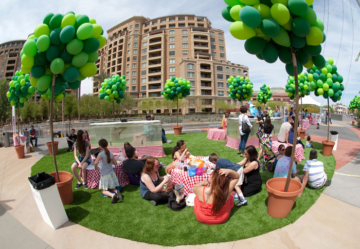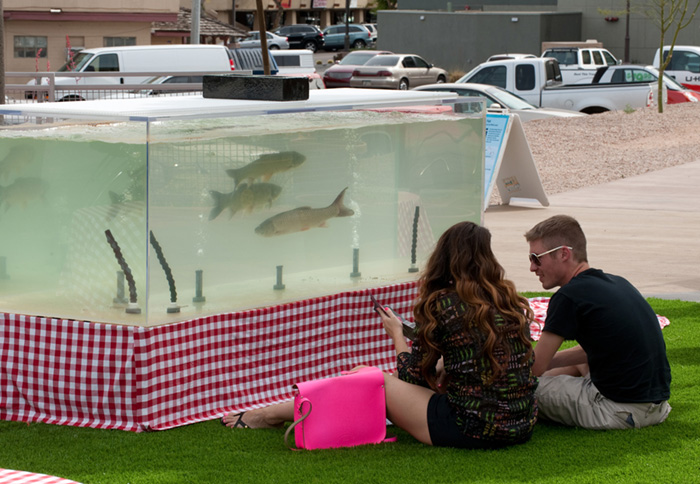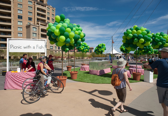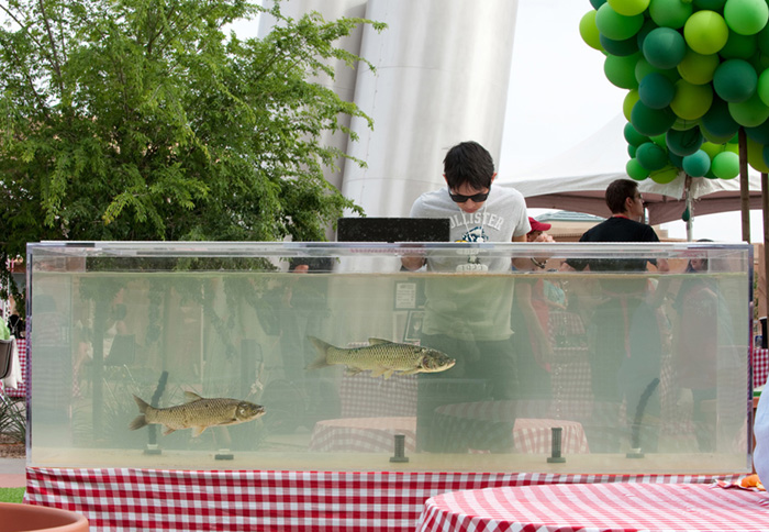 The Soleri Bridge Plaza was transformed for one day into a surreal park featuring White Amur, the fish used to clean the canal by the plaza. Artificial turf, balloon trees, picnic blankets, a DJ playing bubbly lounge music, and three large fishtanks created an environment where visitors were able to share a meal in the company of their finned friends. People were invited to bring a picnic basket, buy a boxed lunch from a nearby restaurant, or take a free orange and from the welcome booth. Historian Marshall Shore and Salt River Project biologist Brian Moorhead were on hand to help visitors understand the use of the fish in the Valley’s canal system.
