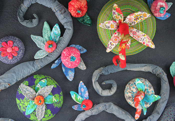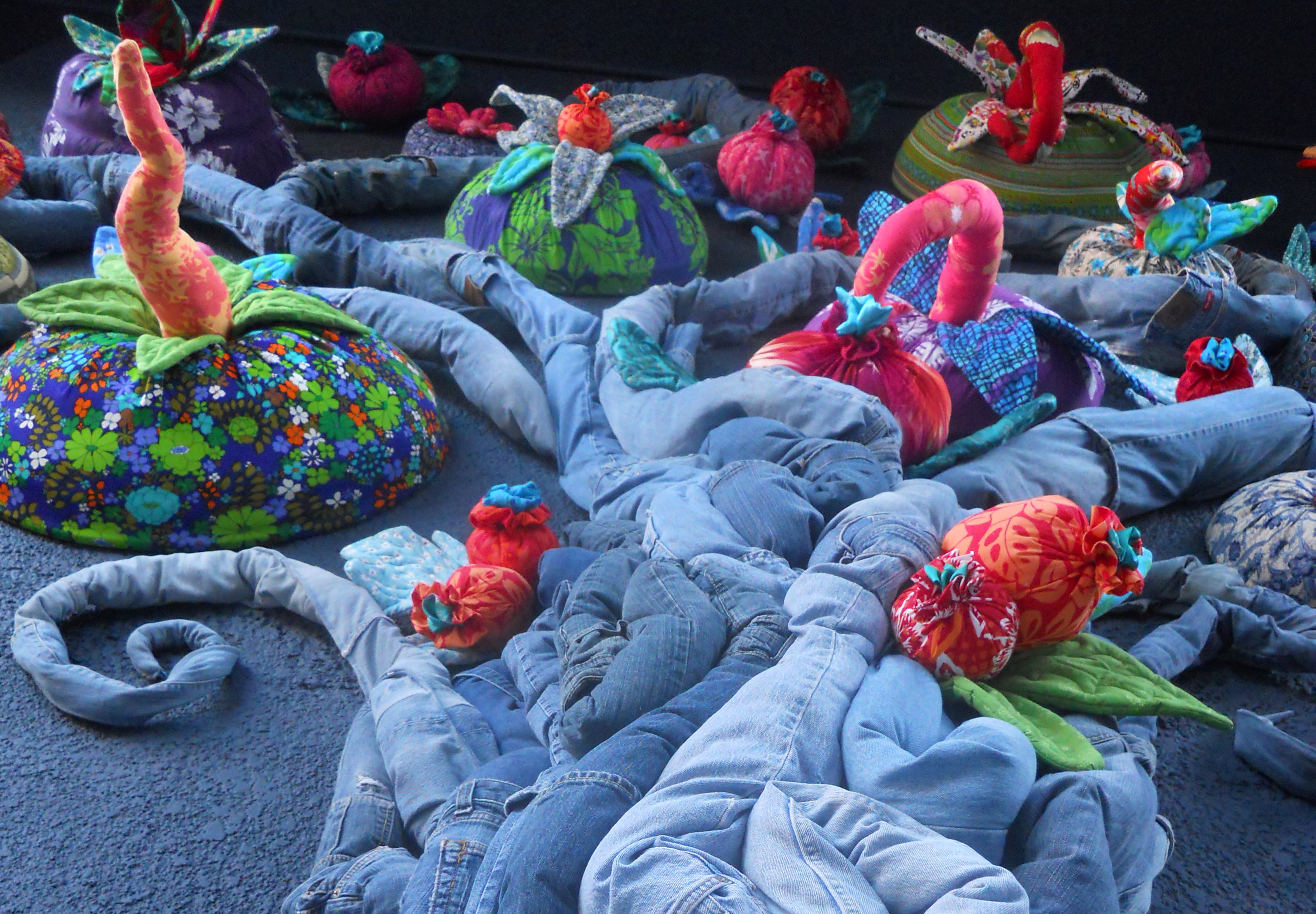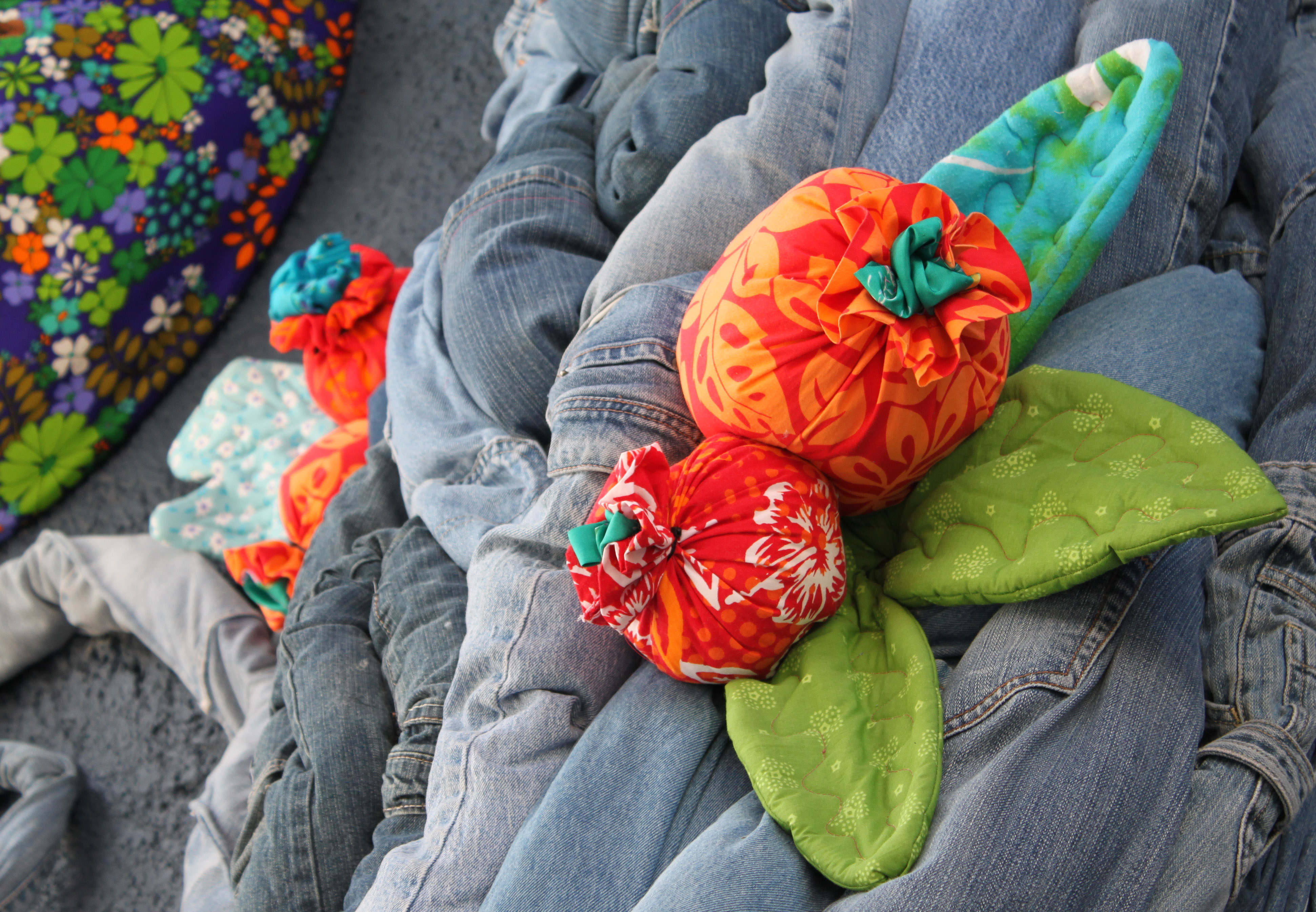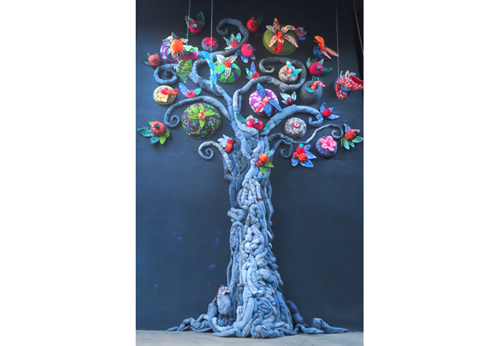 This 20-foot tall soft-sculpture tree was built almost entirely from recycled materials. These materials included: used bluejeans, hand-me-down Hawaiian