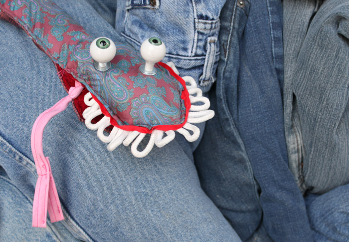 shirts, secondhand swimwear, and all kinds of donated or thrift-store-bought clothing. The stuffed tree trunk was