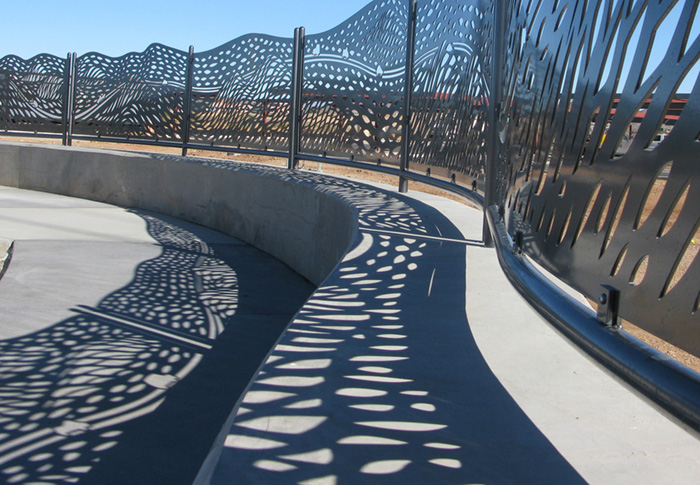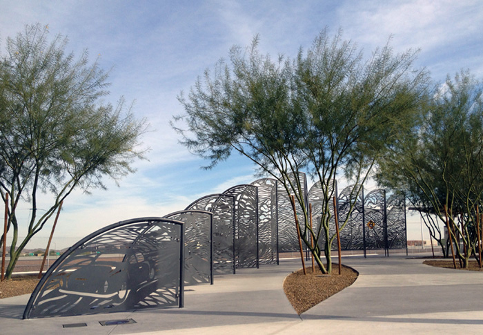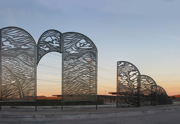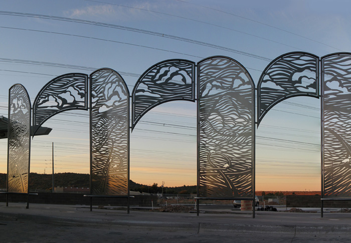A plaza on the outskirts of Phoenix gives riders a comfortable place to wait for buses. Working with the project's design team, I developed a large outdoor plaza for people waiting for buses into Phoenix. The design includes large-scale shade screens, decorative railings, and seating. The main shade screen provides shade and seating for passengers, and creates a grand entry into the site. The cut-steel screens and railings feature stylized images of routes down out of the surrounding foothills, into the traffic interchanges that can be seen from the site. The artwork’s title comes the song by Supertramp.