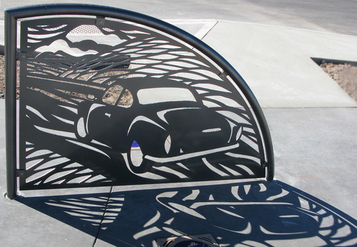 The cut-metal designs in these panels look a bit like woodcuts, but the design was mostly driven by safety and physical constraints of working in metal in a public space: Edges have to be smooth so they don’t point or catch, connections have to be wide enough so they won’t bend or break, holes have to be small enough to be safe for small children, the design should discourage climbing, and detailed enough to discourage graffiti. Figuring out a design vocabulary within these parameters—how to draw cars and faces and skies with smooth and connecting lines—leads to the look of the panels. Each time I design another piece, I learn more about what is possible in this medium.