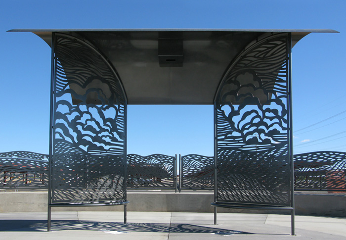 Powder coated steel shade structures, railings, and bus shelter and landscape design.